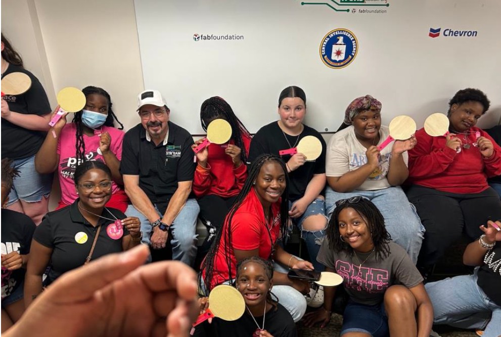 Dr. White's FAMU students display their new personalized ping pong paddles.